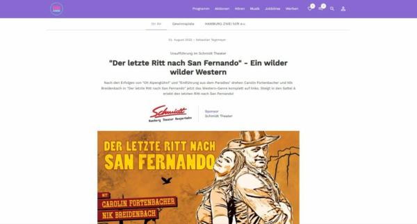 Carolin Fortenbacher, die wir spätestens durch das Musical „Mamma Mia“ kennen und Schauspieler Nic Breitenbach geben in diesem Bühnen Western alles. Sie selbst bezeichnen sich als „Rampensäue“ und sie feuern ein musikalisches und komödiantisches Feuerwerk ab. Damit das vorab in und um Hamburg bekannt gemacht wird, gabs bei unserem Sender für die Generation Golf HAMBURG ZWEI eine „Der letzte Ritt nach San Fernando“-Themenwoche.