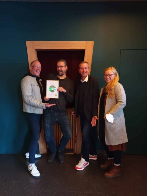 Die Theatermacher Henning Mehrtens und Nik Breidenbach waren sichtlich gerührt von der Auszeichnung. Und auch Marie-Luise Chammas aus der Markertingabteilung des Schmidt Theaters und more Marketing Mediaberater & Moderator bei HAMBURG ZWEI Eike Buschmann freuen sich sichtlich mit.