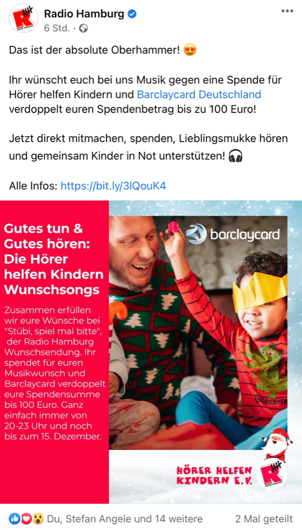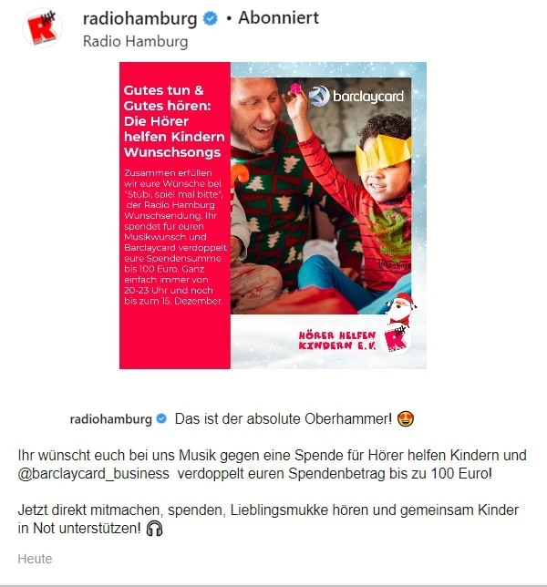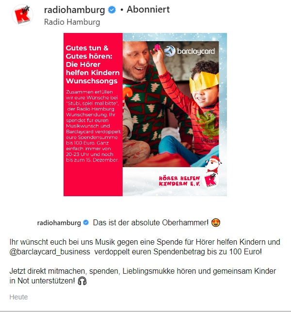 Zusammen mit Barclaycard sagte Radio Hamburg: Dieses Jahr erst recht! Ganz Hamburg hilft, packt an und unterstützt Hamburgs, Niedersachsens und Schleswig-Holsteins Kinder und Jugendliche in Not bei der großen Hörer helfen Kindern Spendensammlung. Und dank BARCLAYCARD konnte Radio Hamburg in diesem Jahr sogar noch mehr zusammen bewegen! Was dafür getan werden musste? Die Hörer*Innen haben sich ihren Lieblings-Megahit gewünscht und gegen eine Spende wurde dieser gespielt.