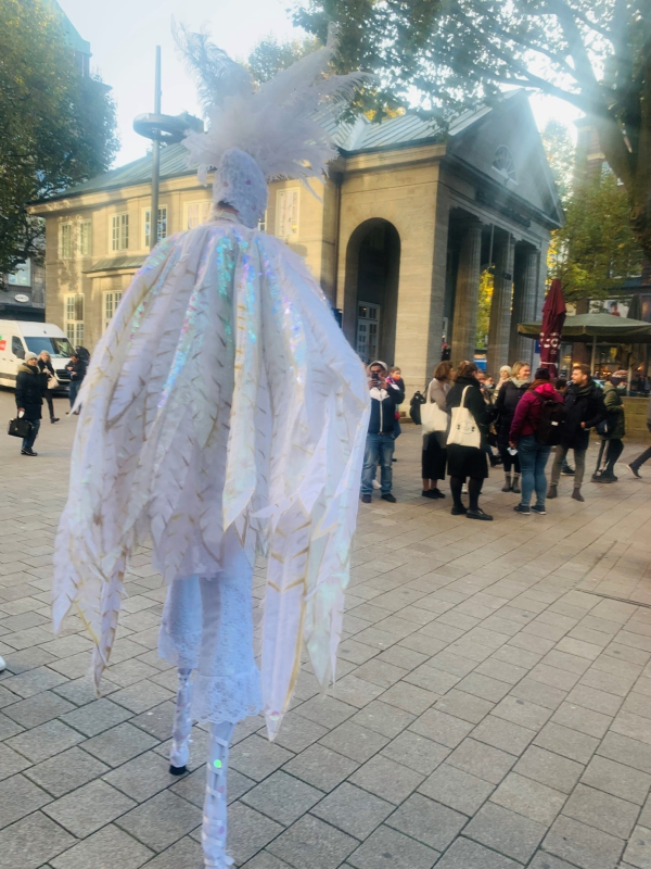 Zusätzlich wurden 2 Stelzentänzer vor dem Laden für Aufmerksamkeit sorgen.