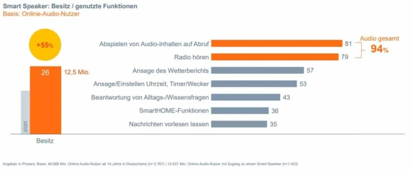 Der Besitz von Smart Speakern steigt um +55%. Gut jeder vierte Online Audio-Nutzer hat Zugang zu mindestens einem Smart Speaker.*