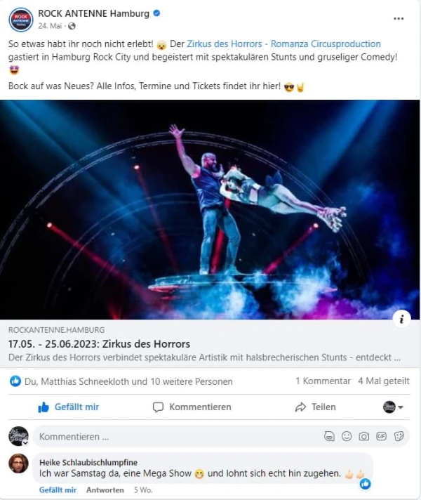 Auch auf dem Facebook und Instagram Account von ROCK ANTENNE Hamburg wurde der Zirkus des Horros eingebunden, um u.a. auf die Verlosungen aufmerksam zu machen.